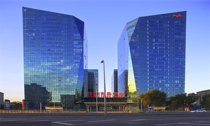 环球贸易中心坐落于北京市核心地带,是一座现代化的商业综合体。大厦外观设计独特,采用了简洁而现代的风格,大面积的玻璃幕墙反射着周围建筑的光芒,显得格外醒目。建筑的顶部设计采用了独特的造型,呈现出一种向上延伸的趋势,仿佛在向天空 стремительно ascending。